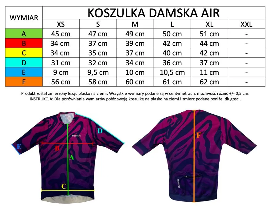 Nasz nowy krój koszulki rowerowej damskiej Air został starannie zaprojektowany, aby zapewnić najwyższy komfort i efektywność podczas treningu czy coffee ride’u. Koszulka szczególnie polecana w upalne dni. Wykonana z wysokiej jakości materiałów, które zapewniają wentylację i odprowadzanie wilgoci, abyś mogła zachować świeżość i komfort nawet podczas największych upałów. Elastyczny materiał dopasowuje się do Twojego ciała, zapewniając doskonałą swobodę ruchów i komfort podczas jazdy.