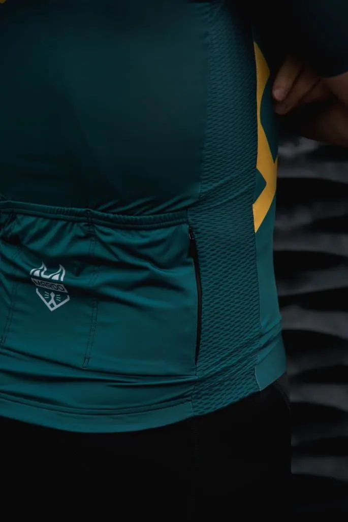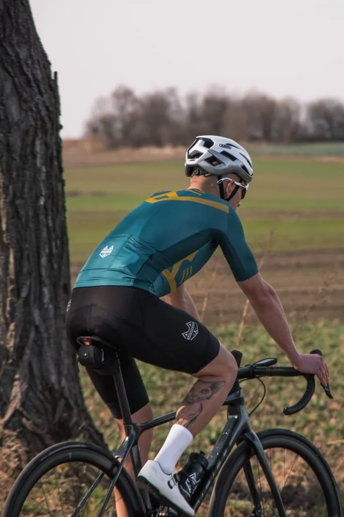 Ta męska koszulka kolarska została wykonana z wysokiej jakości materiałów, które świetnie dopasowują się do ciała i jednocześnie nie krępują ruchów. Koszulka jest szybkoschnąca i oddychająca, co zapewnia komfort podczas jazdy. Klasyczny krój w połączeniu z kolorem butelkowej zieleni zapewnia atrakcyjny wygląd. Możesz bez obaw pojechać w niej na każdą kolarską ustawkę. Materiały zostały dobrane tak, aby sprawdzały się w różnych warunkach pogodowych. W upalne dni koszulka będzie idealna jako jedyny górny element odzieży kolarskiej, z kolei w chłodniejsze, sprawdzi się jako jedna z kilku warstw.