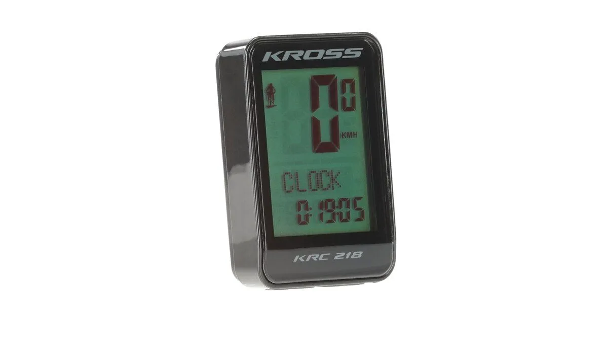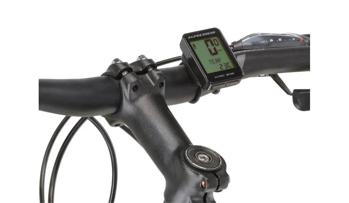Kross KRC 218 ma duży, solidny i jasny wyświetlacz, zapewniający intuicyjną i bezproblemową obsługę. Licznik posiada aż 18 funkcji, dzięki którym użytkownik może w łatwy sposób sprawdzić osiągane podczas treningu wyniki. Zegar może działać w trybie dwunasto- lub dwudziestoczterogodzinnym. Wyposażony jest w 7 różnych funkcji rowerowych wskazujących dystans całkowity, dystans tygodniowy, porównanie prędkości aktualnej ze średnią, prędkość aktualną, prędkość maksymalną, prędkość średnią i dystans dzienny. Spośród funkcji ogólnych warto wymienić Auto scan, analogowy wskaźnik prędkości, ślad węglowy, licznik spalanych kalorii, termometr oraz możliwość wyboru jednego spośród pięciu dostępnych języków. Automatycznie uruchamia licznik, kiedy rower zacznie się poruszać, czyli AUTO ON/OFF. Podświetlenie licznika umożliwia użytkowanie go również w nocy, natomiast w ciągu dnia duży, jasny wyświetlacz umożliwia szybkie odczytanie wskazań. Ponadto licznik posiada stoper oraz funkcję mierzącą czas jazdy i sumującą tygodniowy czas.