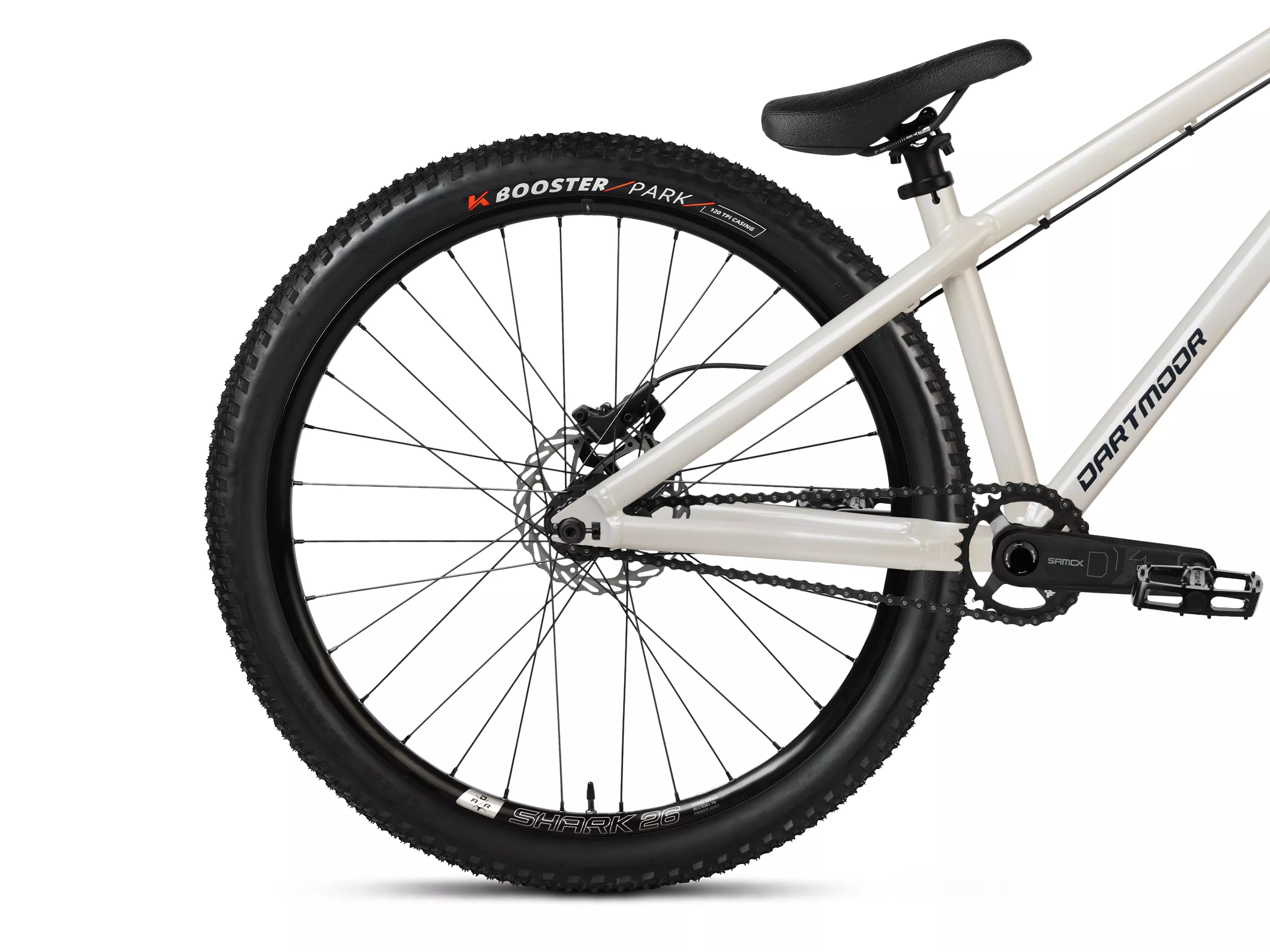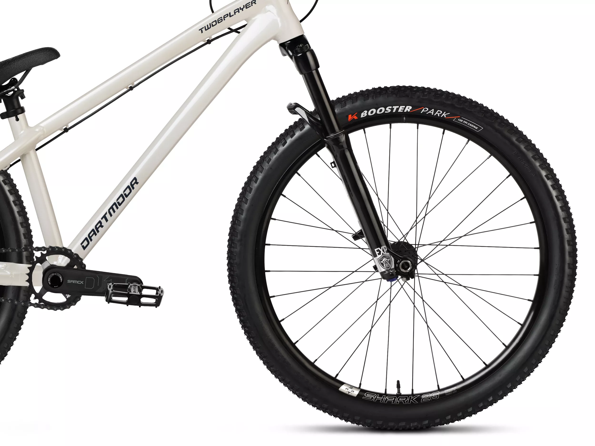 Projektując Dartmoor Two6Player Evo White Pearl, skupiono się na maksymalnej sztywności i niezawodności. Krótki tylny trójkąt oraz odpowiednio dobrany kąt główki ramy zapewniają szybkie wybicie i pełną kontrolę w locie. Amortyzator Manitou Circus o skoku 100 mm został zaprojektowany typowo pod dirt jump, dzięki czemu świetnie radzi sobie z twardymi lądowaniami i intensywną jazdą w skateparku lub bike parku. Jednorzędowy napęd minimalizuje ryzyko awarii i pozwala skupić się wyłącznie na jeździe, a hydrauliczny hamulec tarczowy daje pewne i przewidywalne hamowanie nawet przy dużych prędkościach. Całość uzupełnia agresywny, minimalistyczny design w kolorze white pearl, który podkreśla charakter roweru.