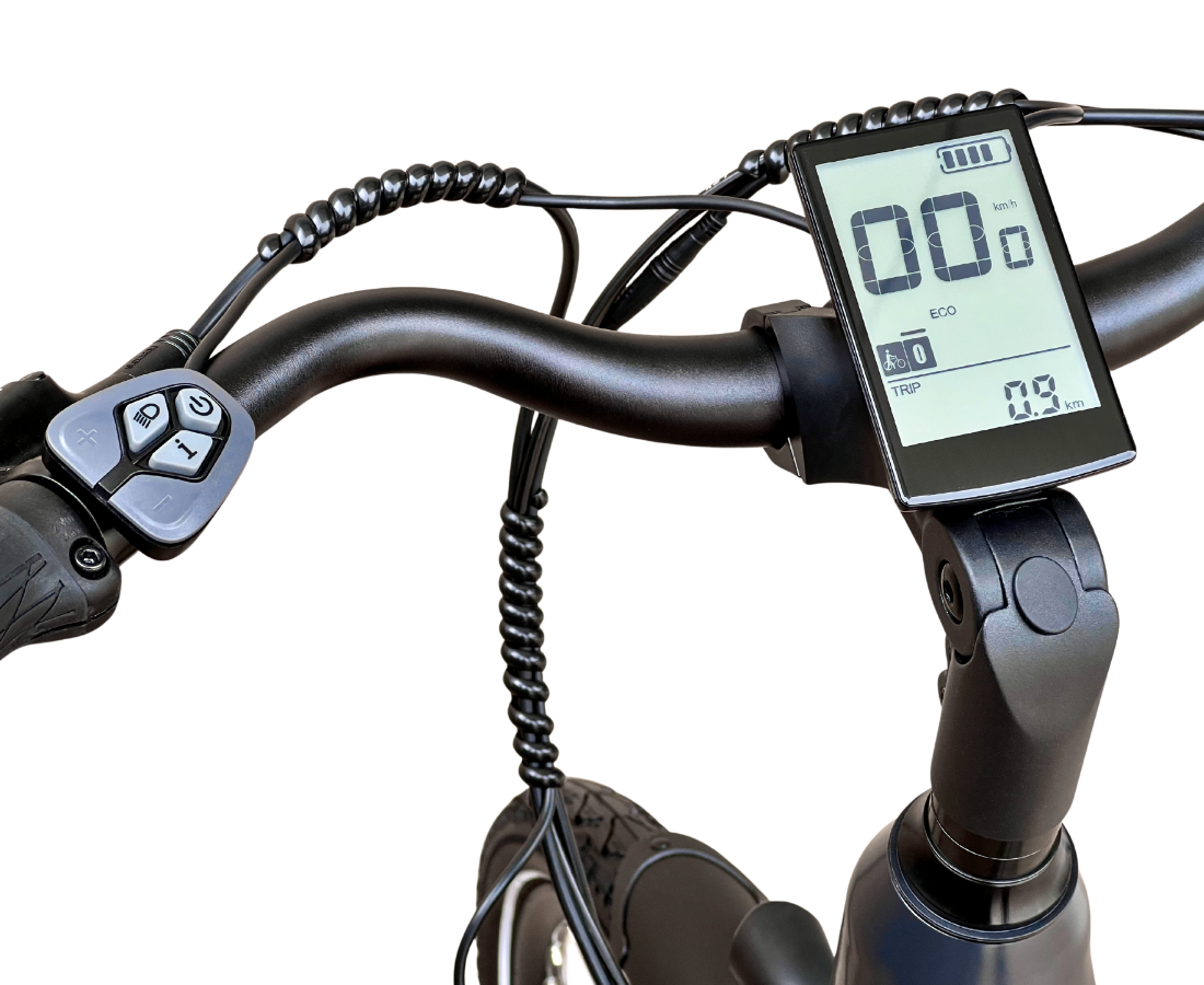 Na ekranie możesz sprawdzić aktualną prędkość, dystans, poziom naładowania baterii czy wybrany tryb wspomagania. Intuicyjne menu i duże, wyraźne cyfry sprawiają, że korzystanie z wyświetlacza jest proste nawet w pełnym słońcu czy podczas jazdy w rękawiczkach.
