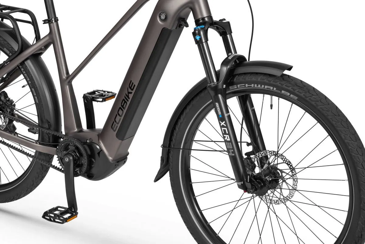 Każdy szczegół w Ecobike Dare został dopracowany pod kątem wygody i bezpieczeństwa. Powietrzny amortyzator Suntour skutecznie tłumi nierówności i ma wbudowany błotnik, który chroni przed zabrudzeniami. Opony Schwalbe AL Grounder gwarantują świetną przyczepność na różnorodnych nawierzchniach, a zintegrowane oświetlenie LED zapewnia widoczność po zmroku.