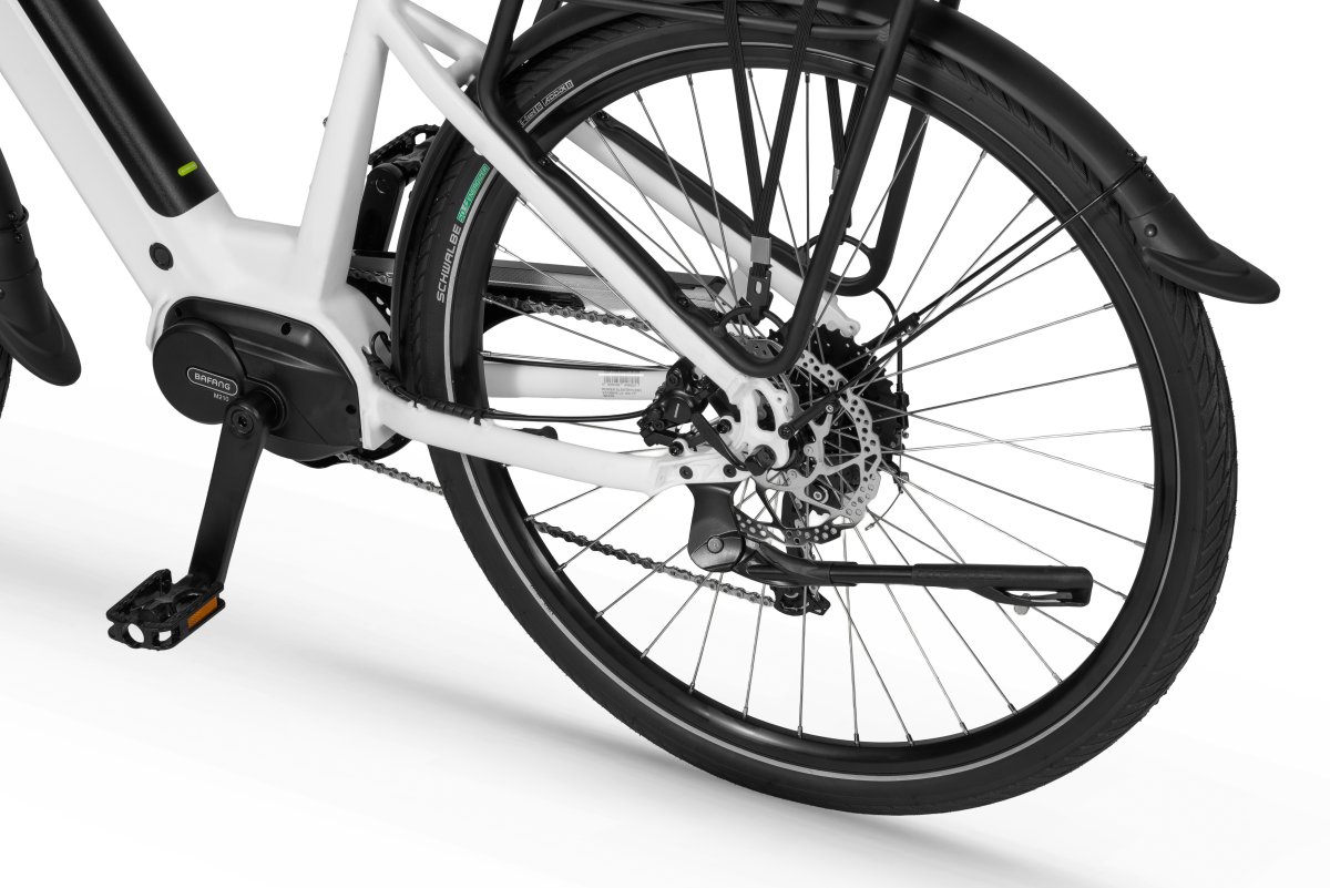 Model LX 100 White wykorzystuje hydroformowaną aluminiową ramę (dostępną w rozmiarach 17" i 19"), co łączy lekkość z trwałością. Duże, 28-calowe koła w zestawieniu z oponami Schwalbe Energizer Plus zapewniają dobrą przyczepność, stabilność i komfort jazdy po różnorodnym podłożu. Widelec amortyzowany SunTour NEX-E25 (63 mm skoku) skutecznie absorbuje nierówności terenu, co zwiększa komfort podczas jazdy miejskiej czy rekreacyjnej. Zarówno hamulce tarczowe hydrauliczne, jak i komfortowe siodło i ergonomiczna kierownica sprawiają, że LX 100 White to rower dobrze przygotowany do codziennego użytkowania. Zintegrowany bagażnik z systemem MIK umożliwia łatwy montaż sakw czy innego bagażu, co czyni ten e-bike praktycznym narzędziem do zakupów, dojazdów czy weekendowych wypraw.