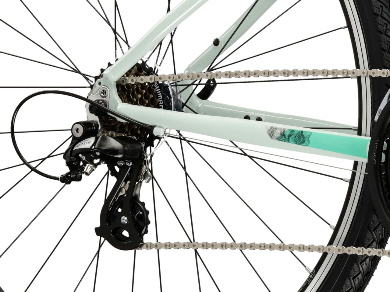 Tylna przerzutka z grupy Shimano Altus gwarantuje szybkie, precyzyjne i responsywne zmiany biegów, co jest szczególnie przydatne podczas jazdy w zmiennym terenie. System działa płynnie nawet w gorszych warunkach atmosferycznych, takich jak deszcz, wilgoć czy błoto. Jest to osprzęt ceniony na całym świecie za trwałość, stabilność działania i intuicyjną obsługę, dzięki czemu rower świetnie sprawdza się u użytkowników, którzy oczekują bezproblemowej eksploatacji.