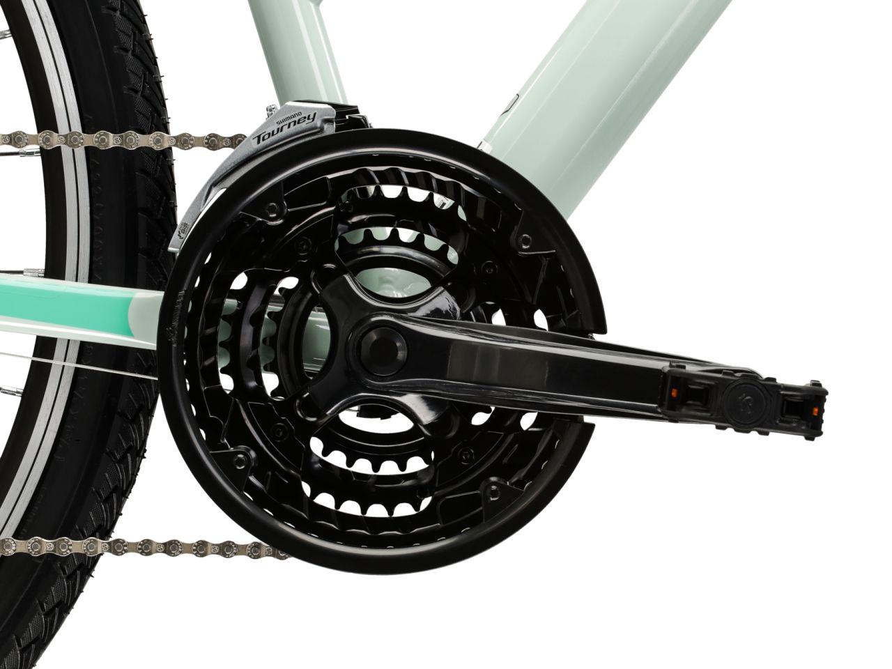 W KROSS Evado 2.0 zastosowano sprawdzony napęd Shimano w konfiguracji 3x7, co oznacza aż 21 dostępnych przełożeń. Tak szeroki zakres umożliwia płynne dopasowanie siły pedałowania do każdego rodzaju trasy, niezależnie od tego, czy rowerzysta porusza się po płaskim odcinku, czy musi pokonać wymagający podjazd.