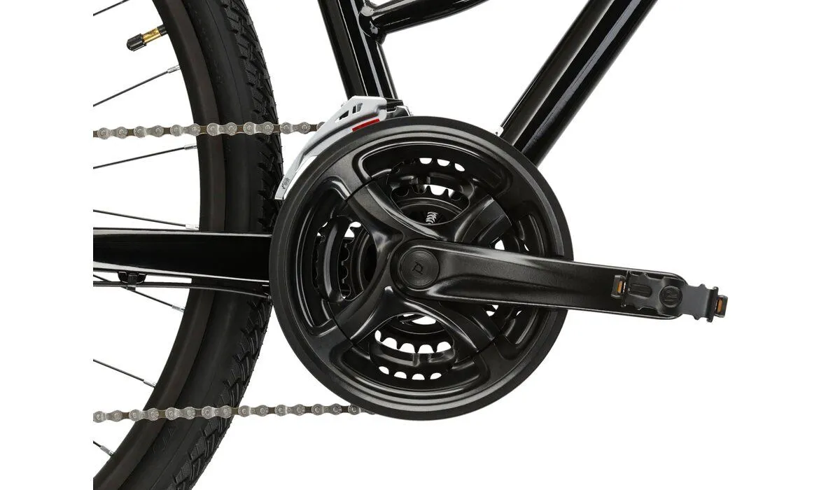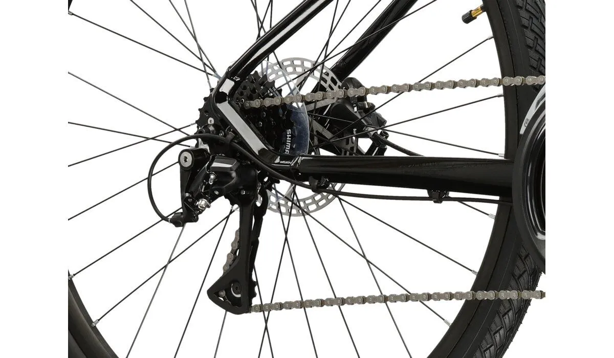 Amortyzowany widelec SR Suntour NEX o skoku 63 mm zapewnia doskonałe tłumienie wibracji i absorpcję wstrząsów podczas jazdy po nierównej nawierzchni. Dzięki niemu bez trudu pokonasz krawężniki czy kostkę brukową, a w lesie będziesz mógł śmiało eksplorować bezdroża. Duże koła o średnicy 28” i opony o szerokości 45 milimetrów zapewniają wysoką przyczepność i stabilność na każdym terenie.