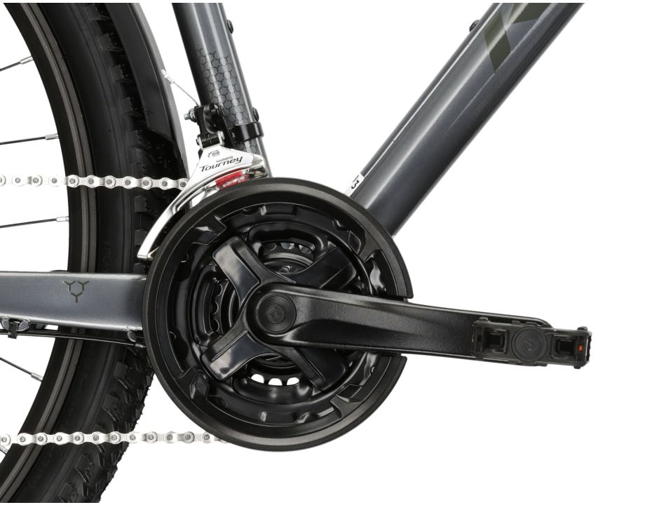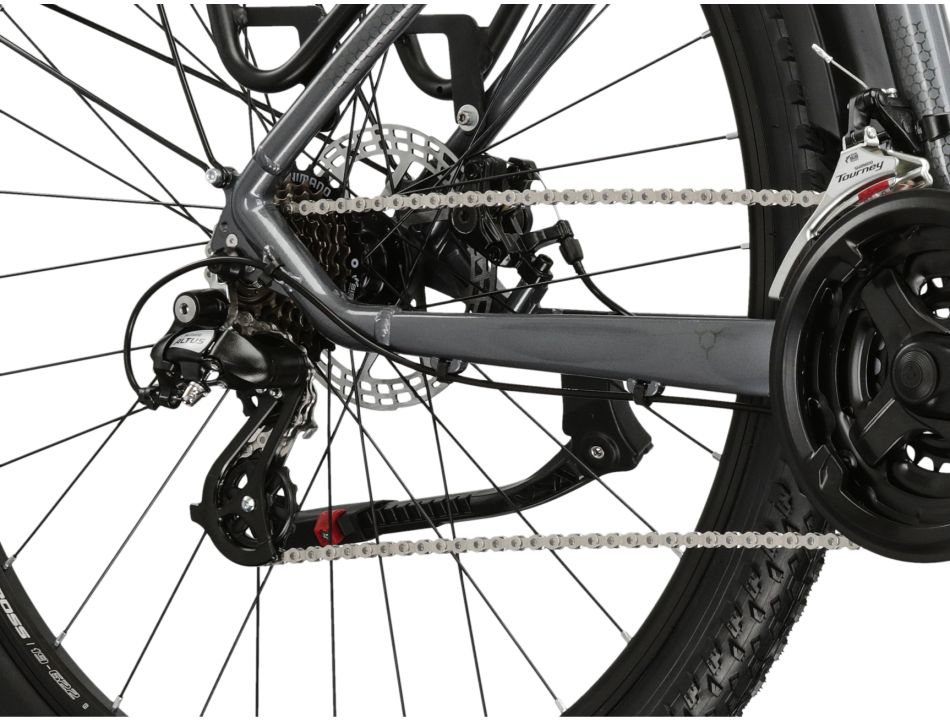 Napęd SHIMANO 3×7 oferuje aż 21 przełożeń, co umożliwia wygodną jazdę zarówno po płaskim, jak i na bardziej wymagających podjazdach. Tylna przerzutka Altus oraz manetki Shimano zapewniają płynną i powtarzalną zmianę biegów w każdych warunkach.