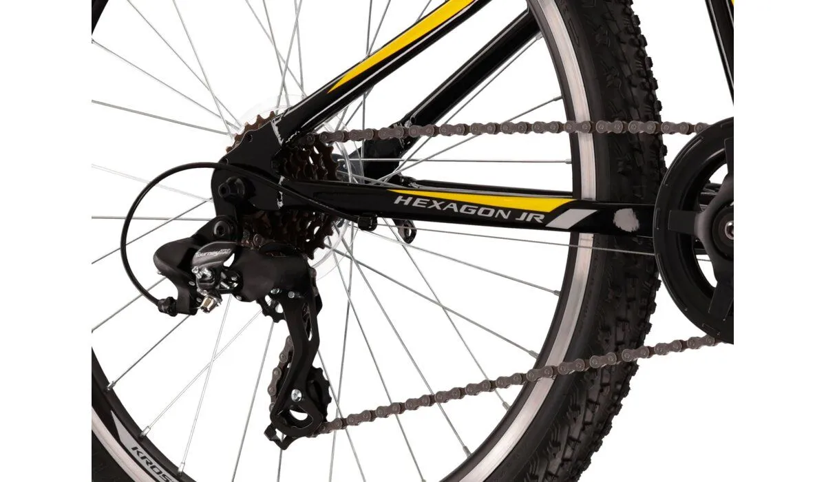 Osprzęt KROSS Hexagon Junior 1.0 oparliśmy o koncepcję napędu 1x8. Do stworzenia takiego napędu wykorzystaliśmy wysokiej jakości komponenty marki Shimano. Pozwoliło nam to stworzyć napęd z ośmiorzędową kasetą obsługiwaną przez tylną przerzutkę SHIMANO TOURNEY TX800. Tak skonstruowany napęd pozwoli dziecku jeździć na komfortową jazdę w każdym terenie. Manetki SHIMANO ALTUS M315 zostały dostosowane do dziecięcych dłoni umożliwiając na ich swobodną obsługę. W rowerze zastosowany został amortyzowany widelec o skoku 50 mm, aby zwiększyć komfort podróży. Został on opracowany specjalnie na potrzeby tego roweru. KROSS Hexagon Junior 1.0 to 24” calowe koła, na które założyliśmy wysokiej klasy opony o szerokości 1,95”, które zapewnią przewidywalne zachowanie roweru zarówno w mieście, jak i w terenie. To także hamulce v-brake, zapewniające bezpieczne hamowanie oraz bezawaryjną obsługę.