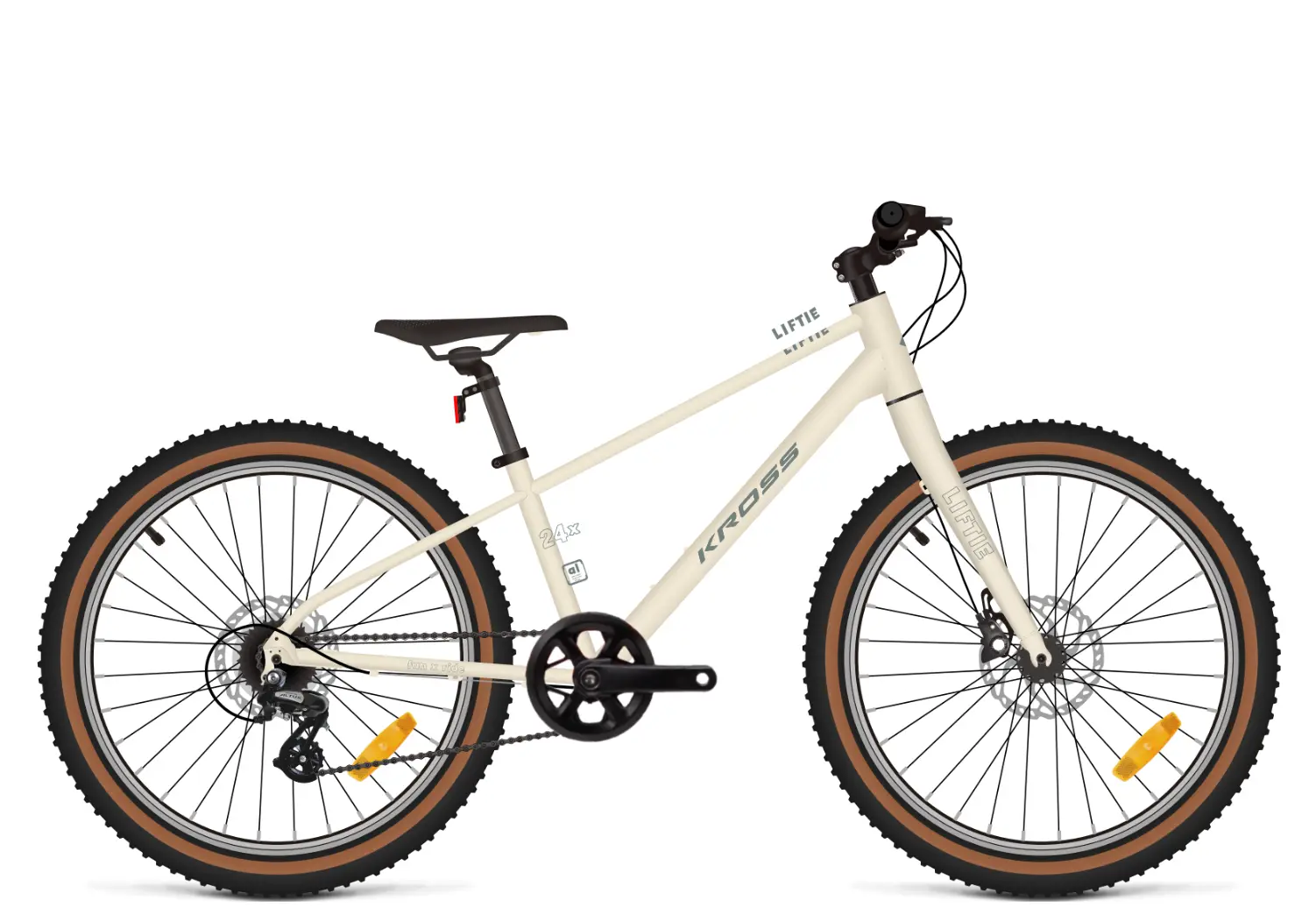 Model Liftie 24 został wyposażony w sprawdzony napęd Shimano 1x8, który eliminuje przednią przerzutkę i upraszcza obsługę, pozwalając skupić się wyłącznie na jeździe. Tylna przerzutka Shimano Altus oraz manetki Rapid Fire umożliwiają szybką i intuicyjną zmianę biegów. Hydrauliczne hamulce tarczowe Tektro zapewniają skuteczne hamowanie nawet przy mniejszej sile nacisku dłoni, co zwiększa bezpieczeństwo dziecka. Opony Vee Crown Gem 2,25 gwarantują dobrą przyczepność na asfalcie, szutrach i leśnych ścieżkach. Aluminiowa kierownica, krótszy mostek oraz chwyty typu lock-on poprawiają ergonomię i kontrolę, a wygodne siodło z szybkozamykaczem ułatwia regulację wysokości w miarę wzrostu dziecka.