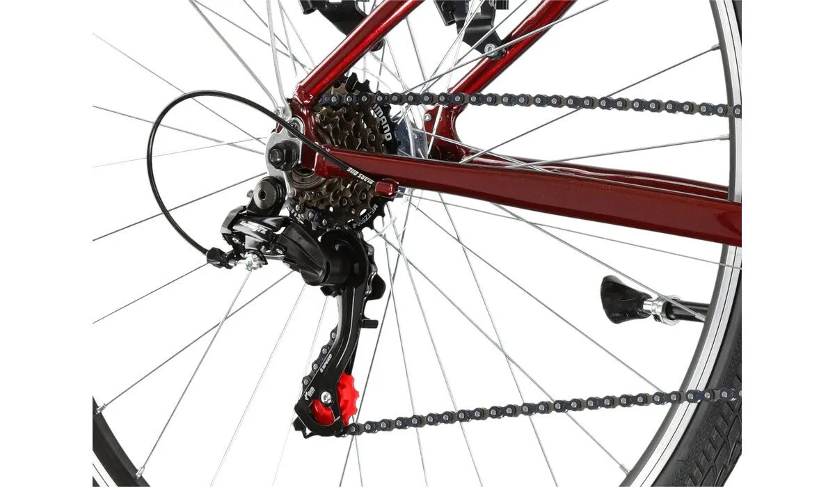 KROSS Sentio 1.0 wyposażony jest w napęd Shimano, który działa w systemie 1x6. Tylna przerzutka Shimano Tourney TZ500 oferuje 6 przełożeń, które pozwalają dopasować optymalny bieg do aktualnych warunków na drodze. Dzięki temu, bez względu na to, czy jedziesz pod górę, zjeżdżasz z wzniesienia, czy poruszasz się po płaskich miejskich ulicach, możesz liczyć na płynną i łatwą zmianę biegów.