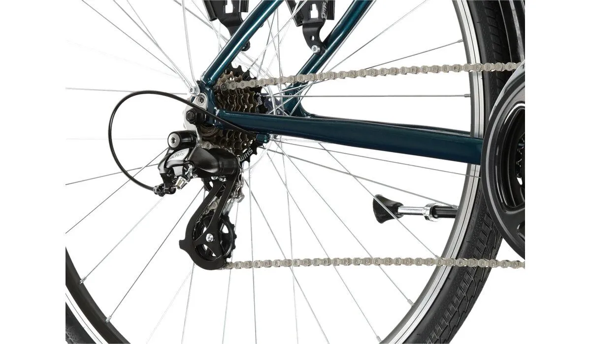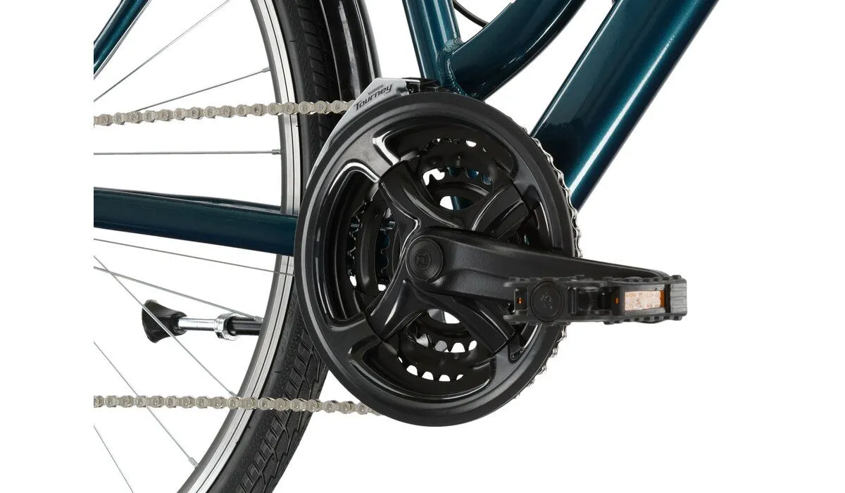 Jednym z najważniejszych elementów roweru jest jego osprzęt, a w KROSS Sentio 2.0 postawiono na niezawodność marki Shimano. Wyposażony w napęd o 21 przełożeniach oraz solidne hamulce typu v-brake, ten model roweru zapewnia pełną kontrolę nad prędkością i wygodę jazdy niezależnie od warunków.