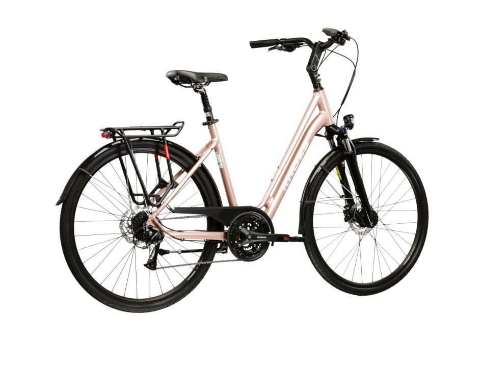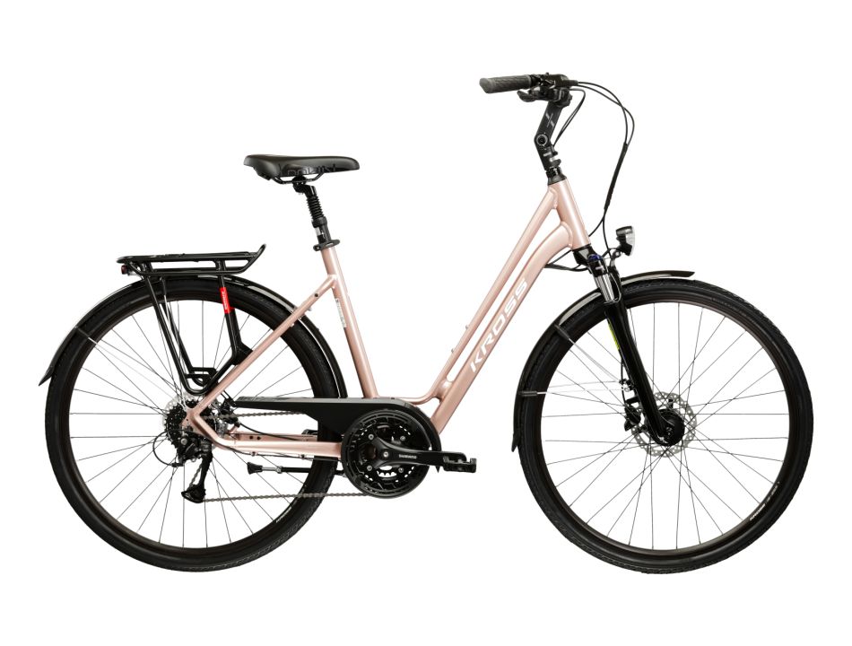 Kross Sentio 4.0 to wszechstronny rower trekkingowy stworzony z myślą o osobach ceniących wygodę, praktyczne rozwiązania i pewne prowadzenie na różnych nawierzchniach. Aluminiowa rama 6061 zapewnia lekkość i sztywność, dzięki czemu rower prowadzi się pewnie i komfortowo. Amortyzowany widelec SR Suntour NEX HLO ze skokiem 50 mm skutecznie tłumi nierówności, co zwiększa stabilność i pozwala cieszyć się płynną jazdą po miejskich drogach, ścieżkach rowerowych oraz lekkich szutrach. Napęd Shimano 3x9 oferuje aż 27 biegów, umożliwiając odpowiednie dopasowanie przełożeń do terenu — idealne na wzniesienia, długie trasy lub szybkie przejazdy po mieście. Eleganckie malowanie różowo-złoto-białe w połysku nadaje rowerowi wyjątkowy styl.