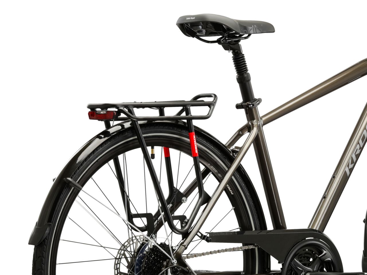 Kross Trans 4.0 został wyposażony w solidny i stabilny bagażnik, który umożliwia przewożenie niezbędnego ekwipunku, a także łatwy montaż dodatkowych sakw. Pełne błotniki to kolejny element, który zwiększa komfort użytkowania roweru, chroniąc przed błotem i wodą podczas jazdy w trudnych warunkach pogodowych.