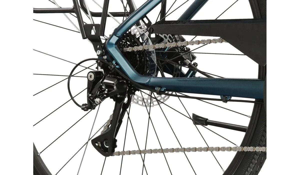 Przy projektowaniu ramy postawiono na wewnętrzne prowadzenie linek, co nie tylko poprawia estetykę roweru, ale także zmniejsza ryzyko uszkodzenia linek podczas jazdy w terenie. Amortyzowany widelec SR Suntour ze skokiem 63 mm sprawia, że rower doskonale radzi sobie zarówno na utwardzonych drogach, jak i na nierównych leśnych ścieżkach, amortyzując uderzenia i zapewniając komfort jazdy.