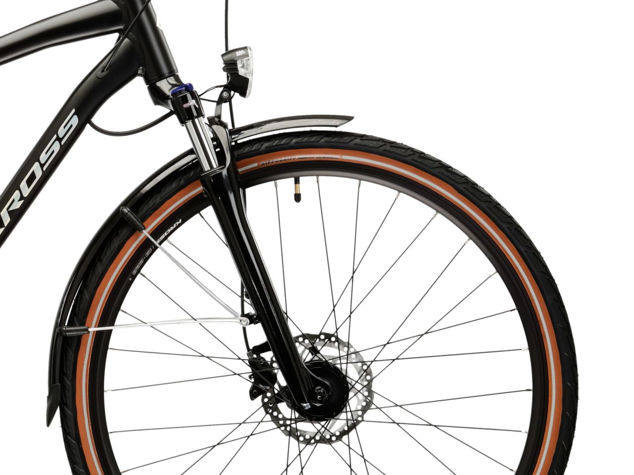 Na wyposażeniu KROSS Trans 5.0 ULT.RA znajduje się zintegrowane oświetlenie, które umożliwia bezpieczną jazdę po zmroku oraz w warunkach ograniczonej widoczności. To rozwiązanie wyjątkowo praktyczne dla osób poruszających się rowerem codziennie, np. do pracy lub na uczelnię. Oświetlenie jest trwałe, odporne na warunki atmosferyczne i zawsze gotowe do działania – bez konieczności pamiętania o ładowaniu zewnętrznych lampek czy ich montażu.
