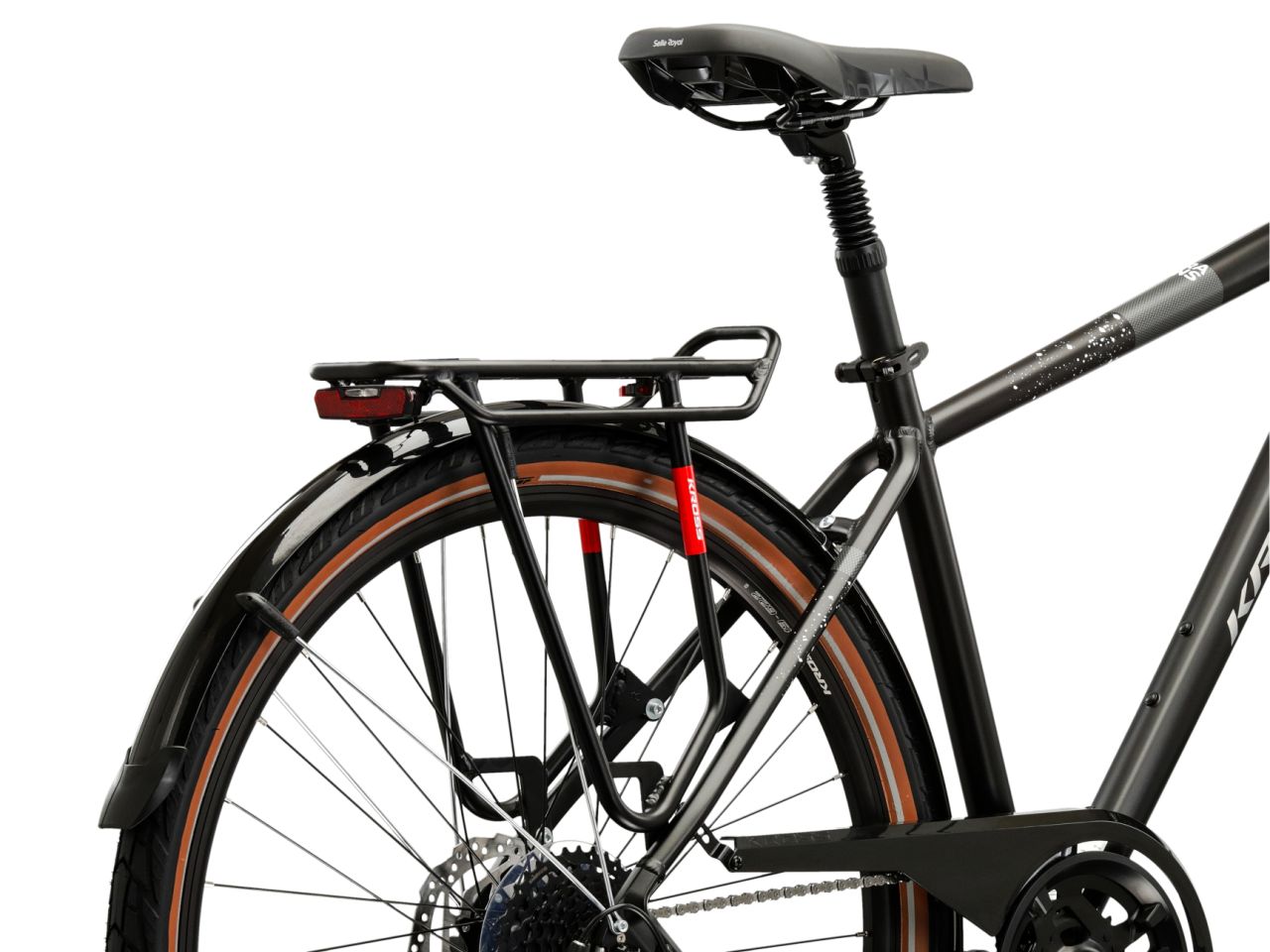 KROSS Trans 5.0 ULT.RA to rower w pełni przygotowany do codziennego użytkowania. Został wyposażony w solidny bagażnik, który umożliwia przewożenie niezbędnego ekwipunku – zarówno w sakwach, jak i luzem. To doskonałe rozwiązanie dla osób dojeżdżających rowerem do pracy, wybierających się na zakupy lub planujących weekendową wyprawę z większym bagażem.