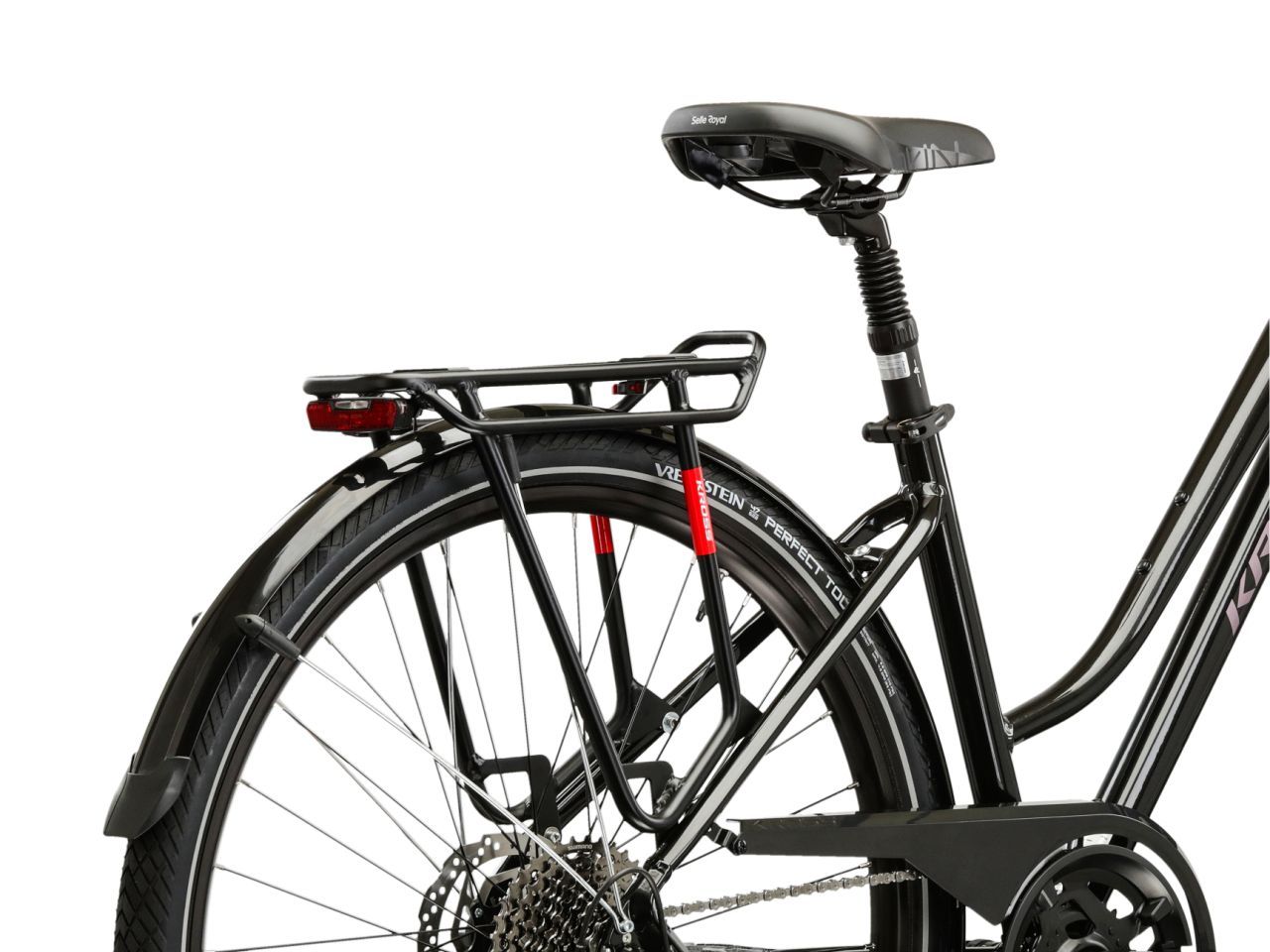 W modelu Trans 7.0 nie mogło zabraknąć również solidnego bagażnika, który pozwala na wygodne przewożenie ekwipunku, zakupów lub montaż większych sakw trekkingowych. Rower wyposażono także w komplet pełnych błotników, które skutecznie chronią przed wodą i zabrudzeniami, co czyni go doskonałym środkiem transportu również w mniej sprzyjających warunkach.