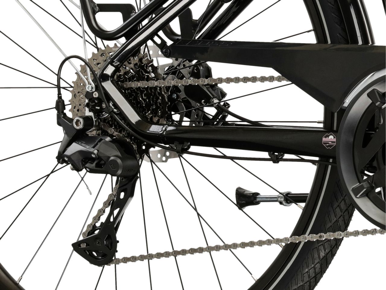 Wewnętrzne prowadzenie linek nadaje konstrukcji estetyczny i minimalistyczny charakter, a jednocześnie znacząco ogranicza ryzyko uszkodzenia przewodów podczas jazdy w terenie. To rozwiązanie sprawia, że rower prezentuje się elegancko i profesjonalnie, a także jest praktyczny podczas codziennych dojazdów.