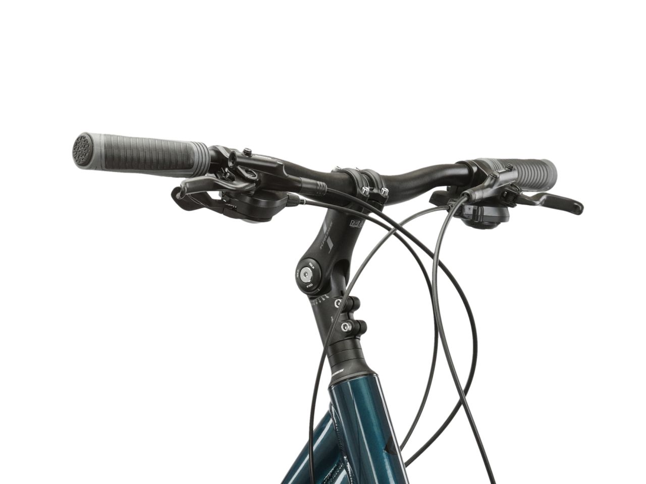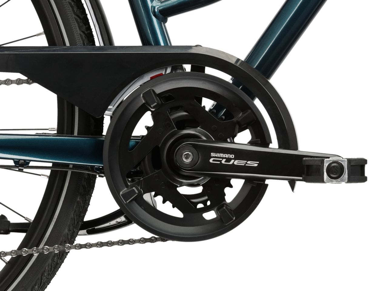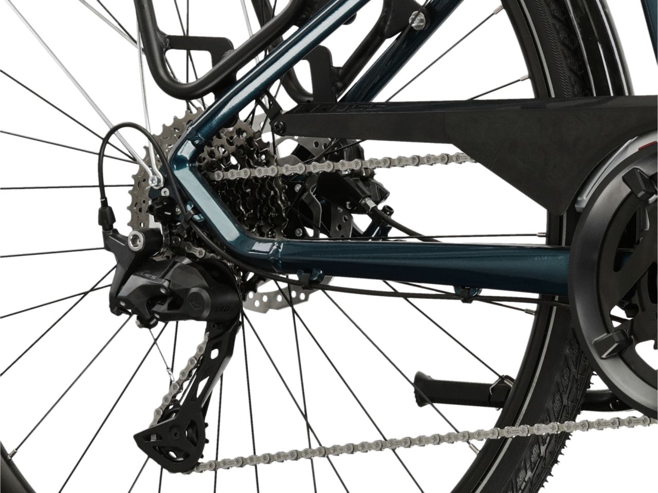KROSS Trans 7.0 został stworzony z myślą o pełnym komforcie użytkownika, niezależnie od charakteru trasy. Napęd Shimano Cues w konfiguracji 2x10 zapewnia aż 20 przełożeń, które umożliwiają płynne dostosowanie oporu do nachylenia terenu czy rodzaju nawierzchni. Tylna przerzutka z grupy Cues gwarantuje precyzyjną zmianę biegów oraz wysoką trwałość, dzięki czemu sprawdzi się doskonale zarówno podczas jazdy rekreacyjnej, jak i dłuższych wypraw.