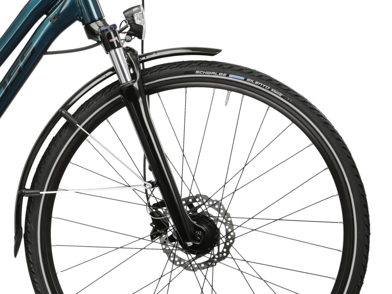 Amortyzowany widelec SR Suntour ze skokiem 63 mm gwarantuje wysoki komfort jazdy po nierównym podłożu. Doskonale radzi sobie z tłumieniem wstrząsów podczas jazdy po kostce brukowej, leśnych ścieżkach czy krawężnikach. Dodatkowa blokada w koronie widelca umożliwia bardziej efektywne pokonywanie długich, płaskich odcinków trasy – idealne rozwiązanie podczas jazdy po mieście czy asfaltowych szlakach.