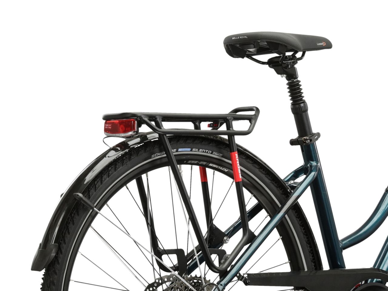 W modelu Trans 7.0 nie mogło zabraknąć również solidnego bagażnika, który pozwala na wygodne przewożenie ekwipunku, zakupów lub montaż większych sakw trekkingowych. Rower wyposażono także w komplet pełnych błotników, które skutecznie chronią przed wodą i zabrudzeniami, co czyni go doskonałym środkiem transportu również w mniej sprzyjających warunkach.
